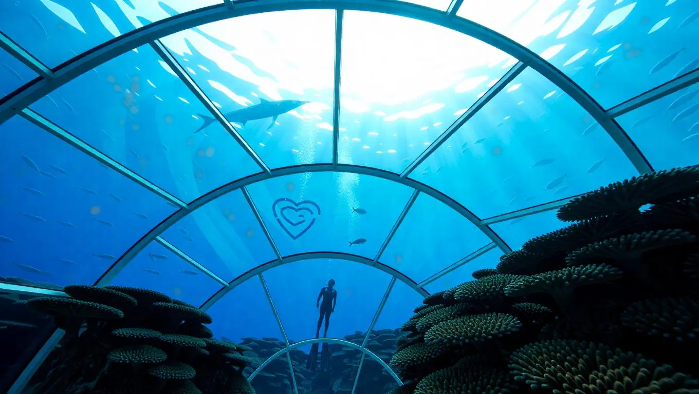 Top-down view of diver depicting heart shapes with fish near brilliant coral formations, schools of needlefish streaking by, beams of sunlight cascading through a modern glass observation dome, presenting a stunning underwater scene.