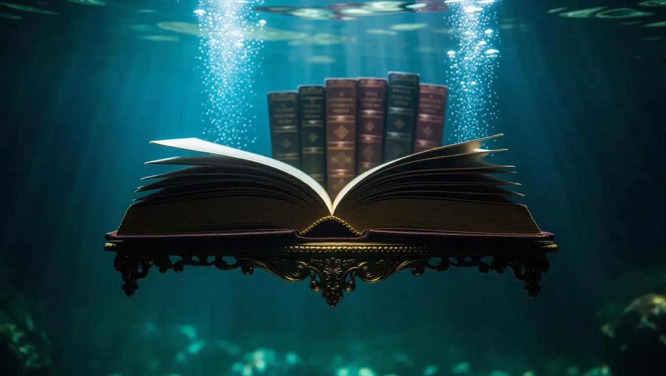 A floating grimoire shelf underwater, ancient and mystical tomes opening and closing like ethereal spirits, surrounded by luminous plankton and shimmering bubbles, casting an otherworldly glow, creating a mystical and enchanting atmosphere.