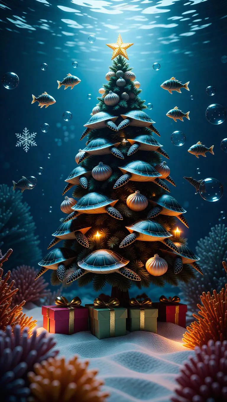 A festive underwater holiday celebration, turtles adorning a vibrant coral Christmas tree, fish exchanging seashell gifts, jellyfish illuminating the scene with bioluminescent glow, snowflakes of bubbles drifting down, creating a magical and enchanting atmosphere.