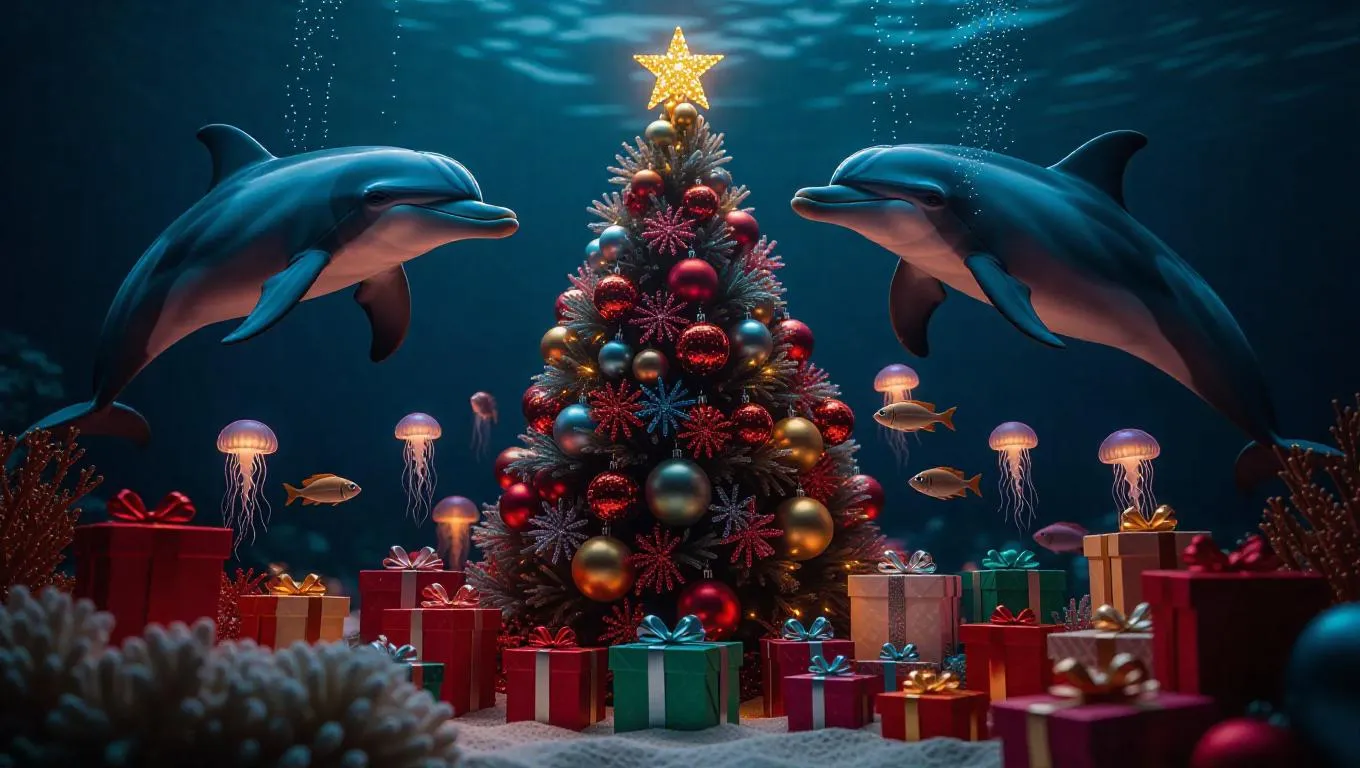 A festive underwater holiday celebration, dolphins adorning a vibrant coral Christmas tree, fish exchanging festive gifts, jellyfish illuminating the scene with bioluminescent glow, bubbles cascading down, creating a magical and enchanting atmosphere.