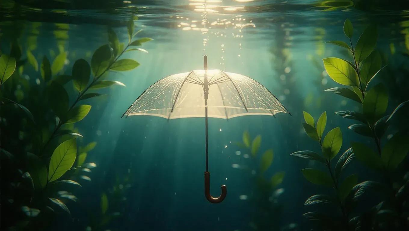 A glowing umbrella gently drifting underwater, surrounded by gentle waves of water plants swishing softly, creating a calming and serene mood, with a gentle, dappled light filtering through the leaves.