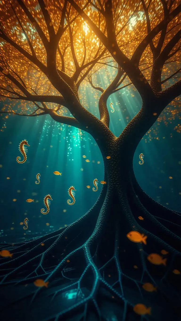An ethereal underwater forest with shimmering golden leaves, roots sprawling out like tendrils, softly glowing seahorses swirling around, bioluminescent plankton twinkling in the water, creating a vibrant, mystical atmosphere.