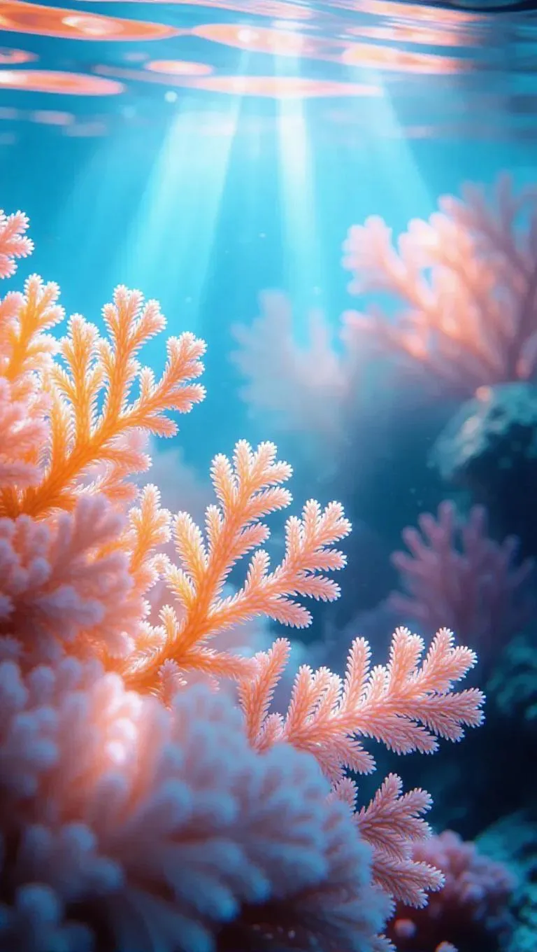 2. Soft-focus dreamy underwater scene of colorful corals swaying softly, pastel colors, gentle ripples, ethereal light beams, and a serene, tranquil atmosphere.