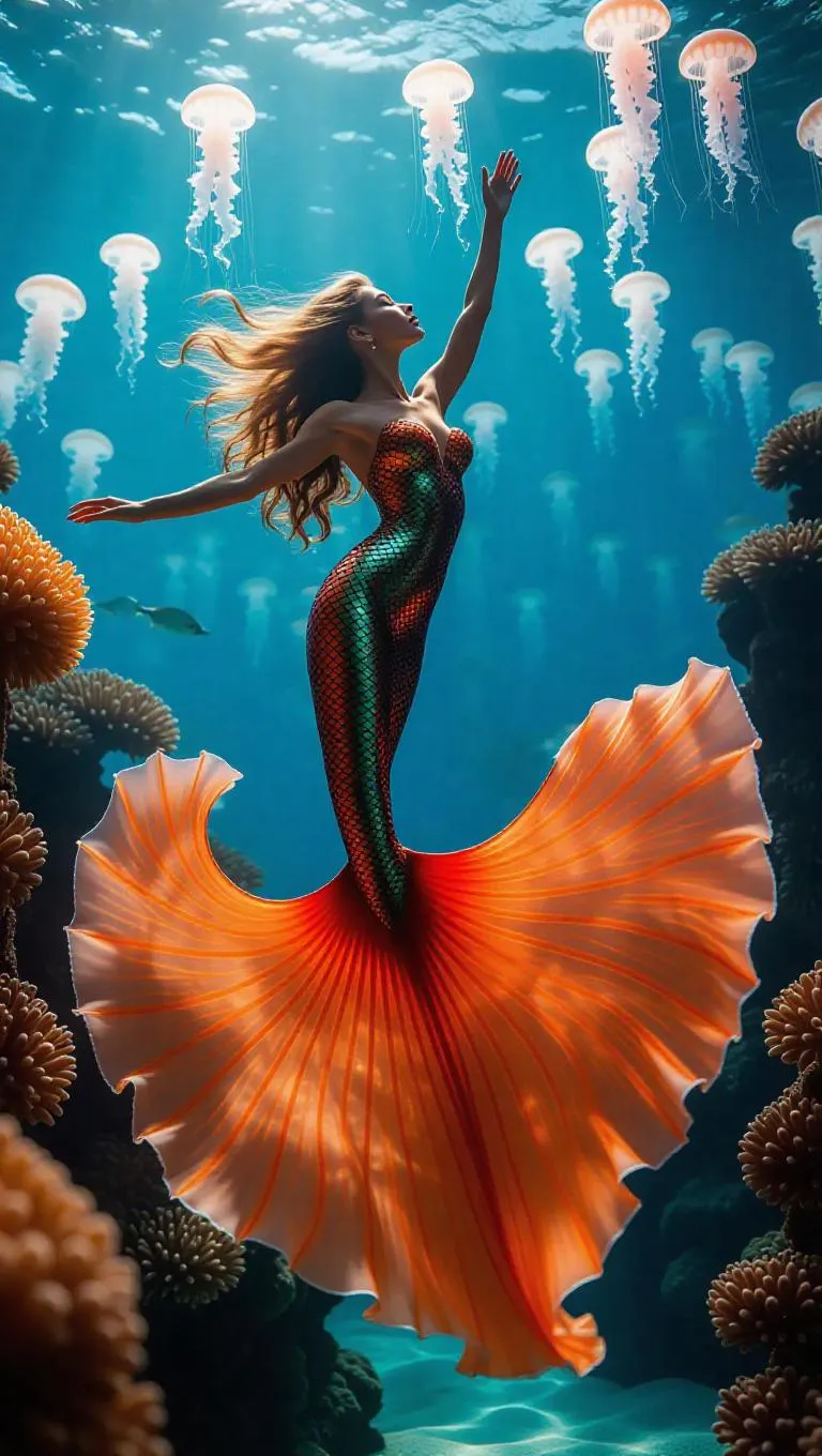 A graceful mermaid performs a mesmerizing routine in a vibrant coral reef, their delicate movements synchronized with the playful waves. Jellyfish emit soft, bioluminescent glows in the background, enhancing the enchanting and magical atmosphere.
