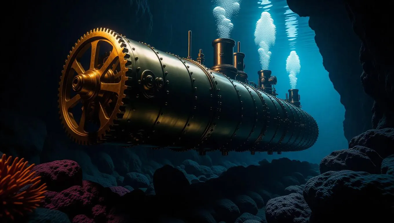Dutch angle shot of a Victorian submarine gliding through an underwater volcano, brass gears rotating amidst volcanic rocks, air bubbles rising from lead sealings, oil-painting style with vivid color contrast, dramatic underwater lighting, intricate mechanical components, vibrant deep-sea life.
