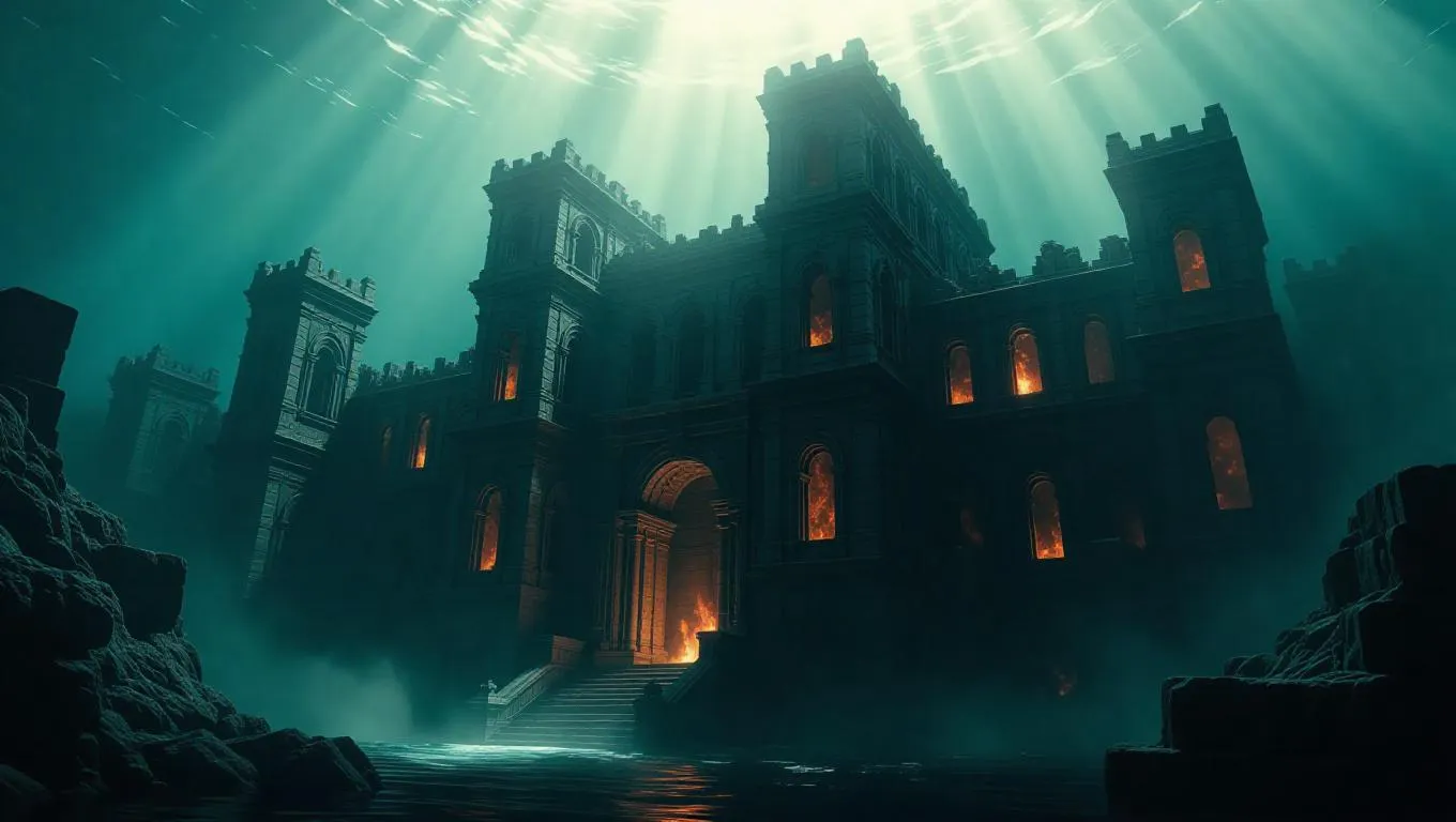 A grand underwater ruins of an ancient fortress, with crumbling stone walls shrouded in swirling currents and fire, illuminated by shafts of sunlight cascading down, creating an eerie and captivating atmosphere.