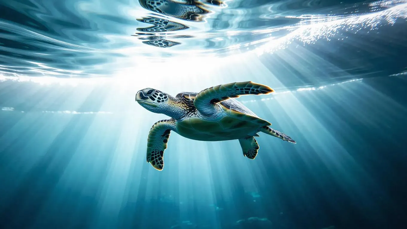 Cinematic shot of a sleek sea turtle swimming beneath ice-covered waters, ethereal light beams piercing through jagged cracks above, creating a mesmerizing underwater glow.