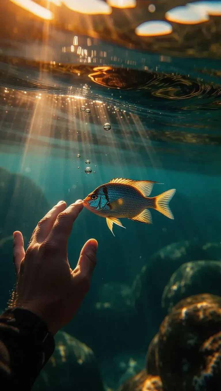 Cinematic close-up of a diver's hand reaching toward an iridescent fish darting through the water, dramatic shadows, ethereal amber light, bubbles swirling around, underwater rocks adding depth and texture