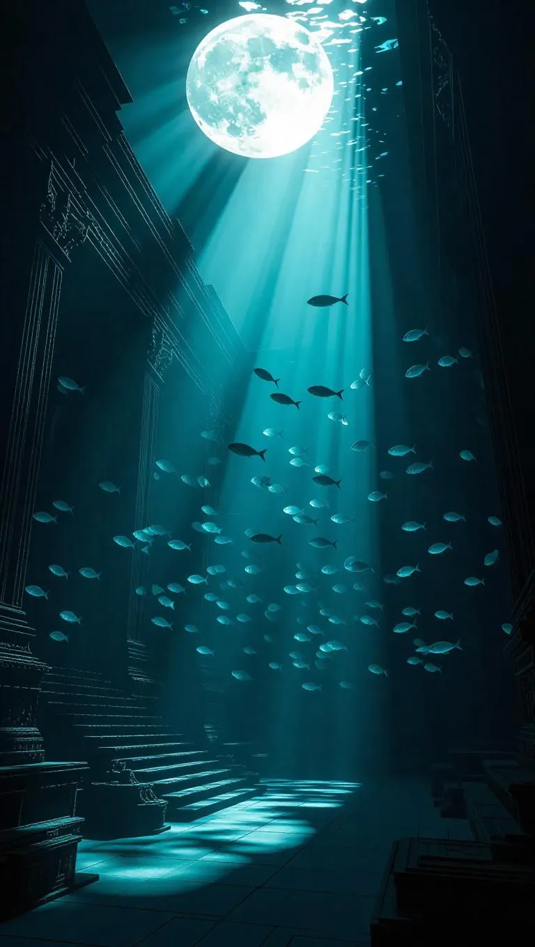 A futuristic scene underwater, with submerged ancient ruins and advanced technology, rays of moonlight piercing through the water, creating a mesmerizing play of light and shadow, moody lighting, highly detailed, surrounded by swirling schools of bioluminescent fish.
