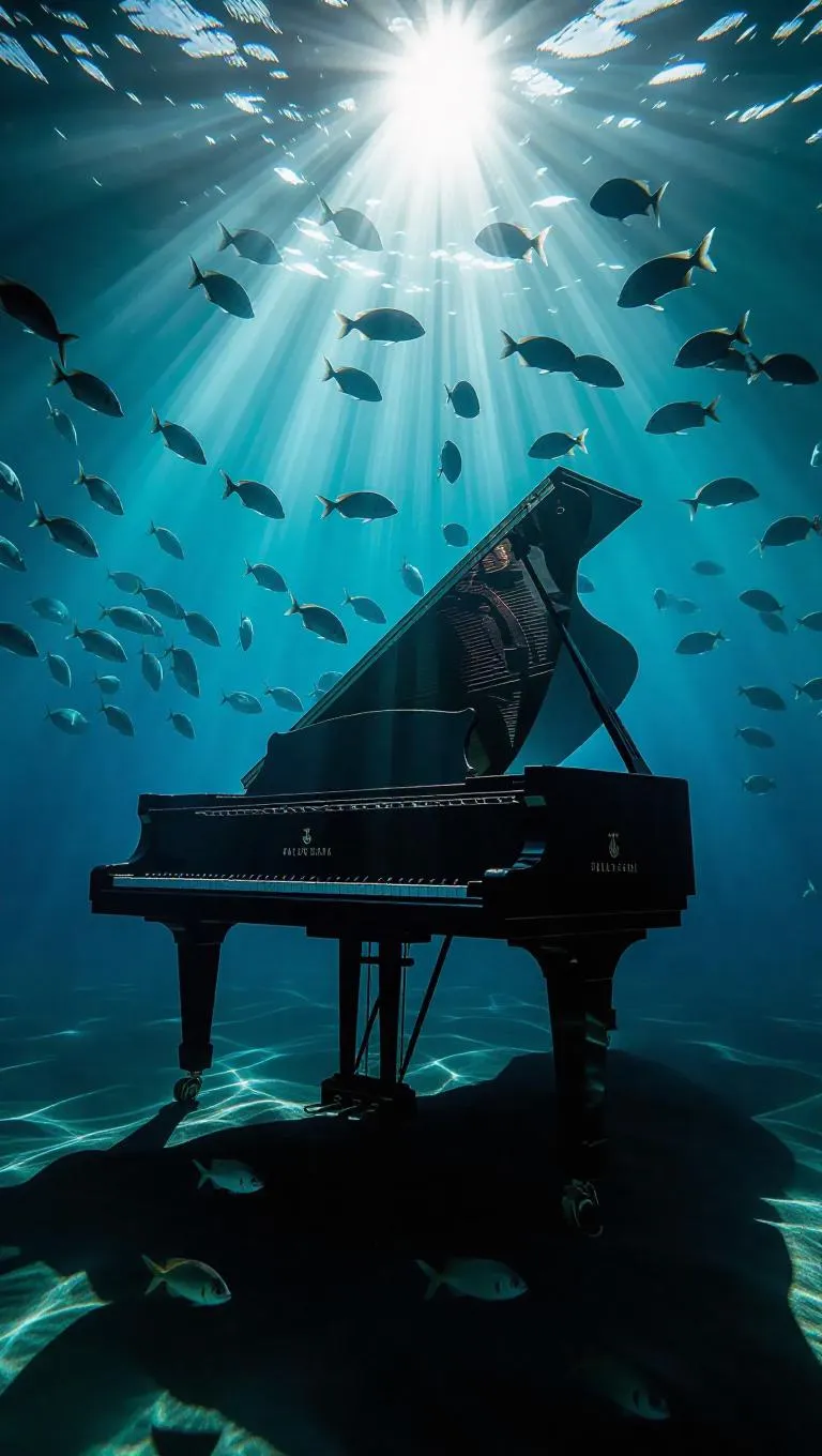 A surreal underwater scene of a grand piano gracefully sinking into the ocean, rays of sunlight piercing through the water, creating a mesmerizing play of light and shadow, cinematic lighting, highly detailed, surrounded by swirling schools of colorful fish.