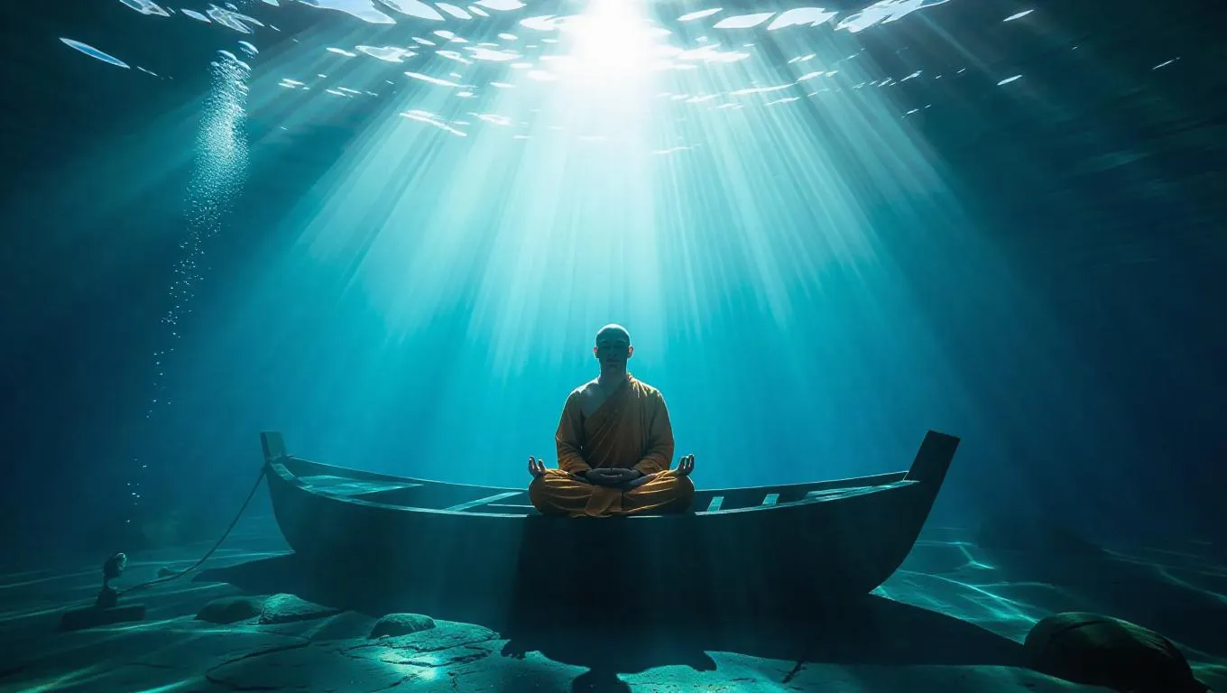 4. An ethereal underwater meditation scene with a serene monk seated cross-legged on a sunken ship, surrounded by shimmering bubbles and radiant light rays piercing through the water, creating a tranquil and mystical atmosphere.