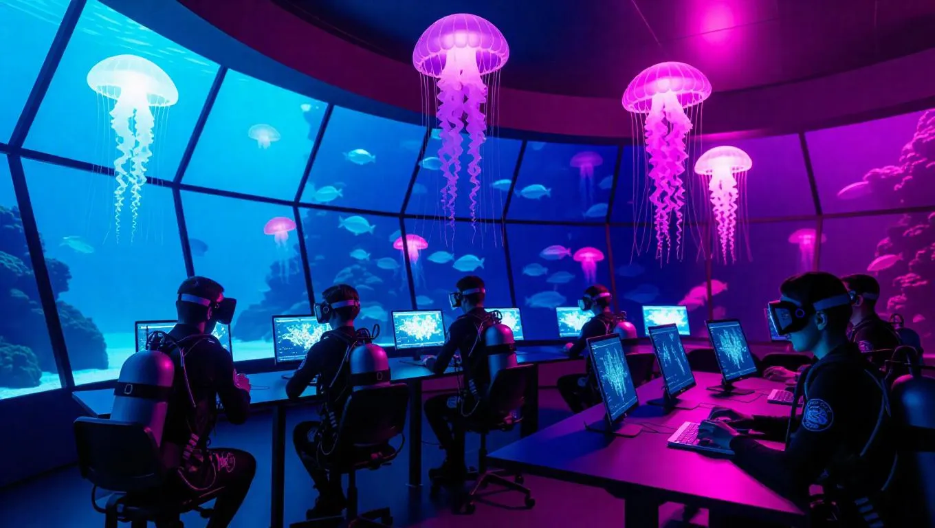 Futuristic underwater dome classroom, holographic screens vividly projecting sustainable living practices, AI jellyfish tutors glowing softly with eco-friendly tips, students wearing high-tech diving suits engaged in taking notes, surrounded by rich marine biodiversity.