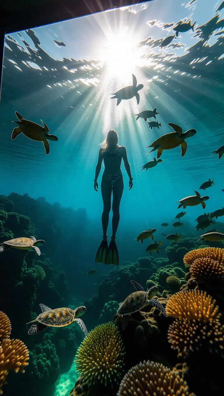 Top-down view of swimmer twirling with sea turtles near a vivid coral landscape, schools of tangs moving fluidly, sunlight shining through a vintage glass observation window, completing a beautiful aquatic scene.