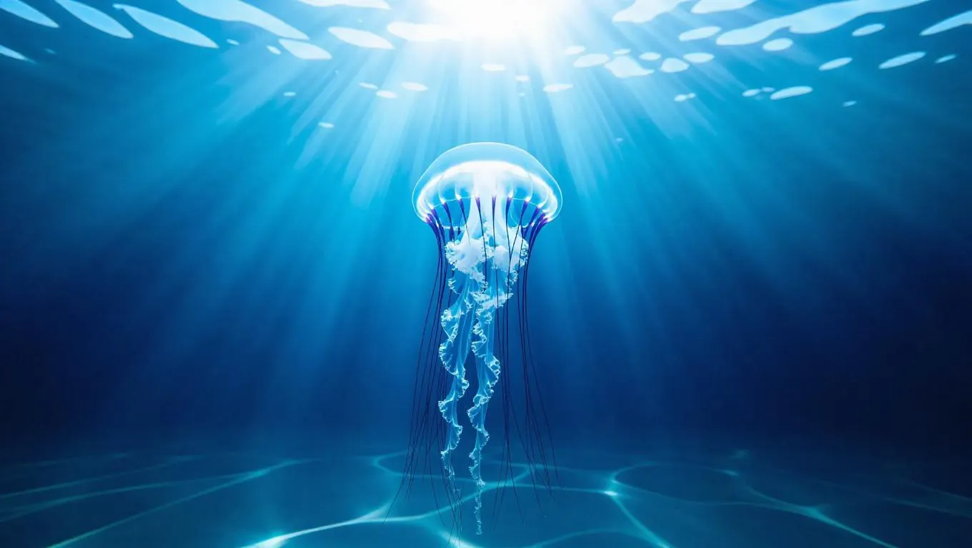 Minimalist underwater scene, a single jellyfish gracefully centered in soft azure waters, soft gradients transitioning from dark to light, clean and elegant lines, ethereal glow.
