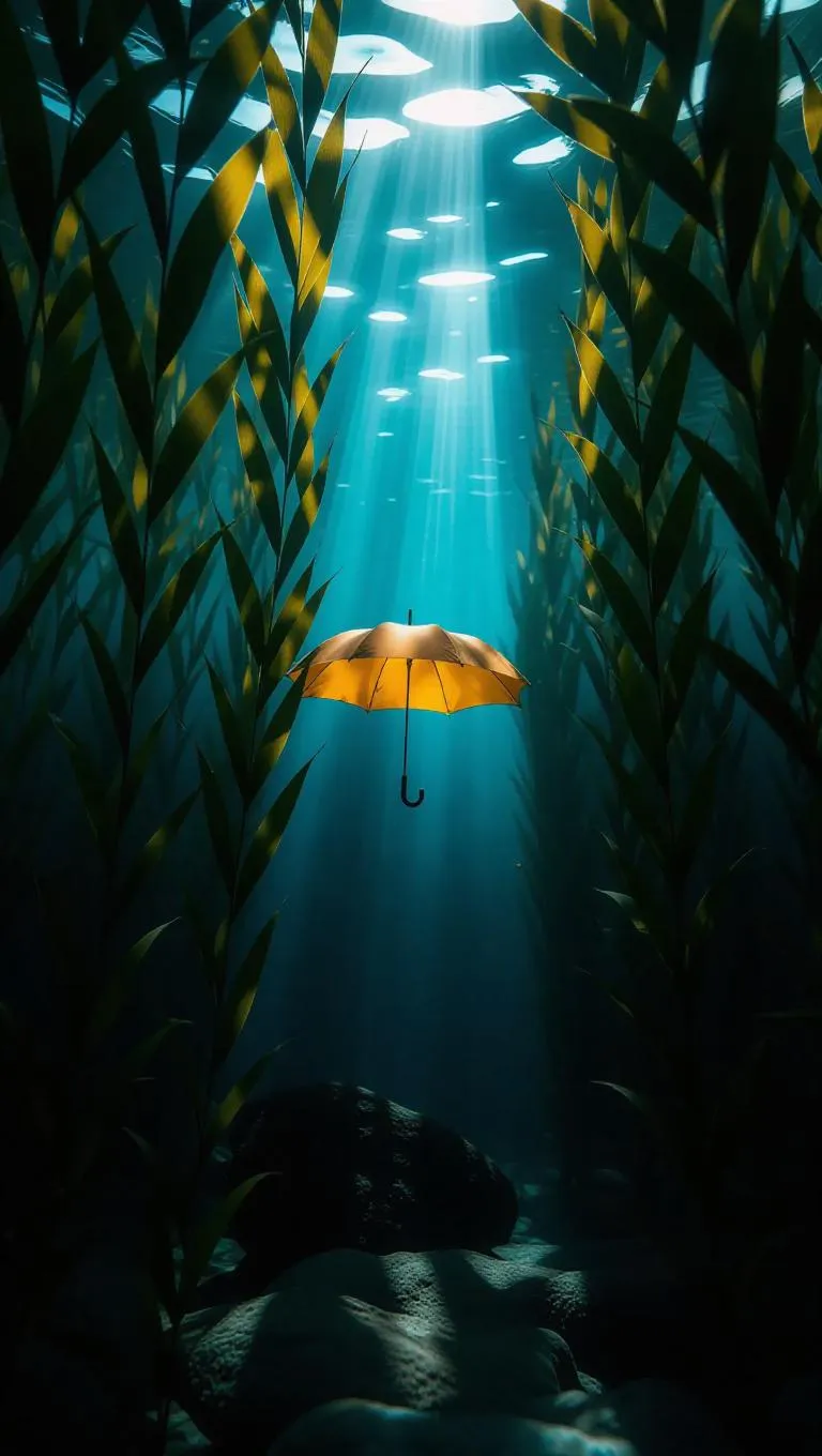 A glowing umbrella gently drifting underwater, surrounded by swaying kelp forests, creating an adventurous and exploratory mood, with a cool, shadowy light obscured by the underwater foliage.