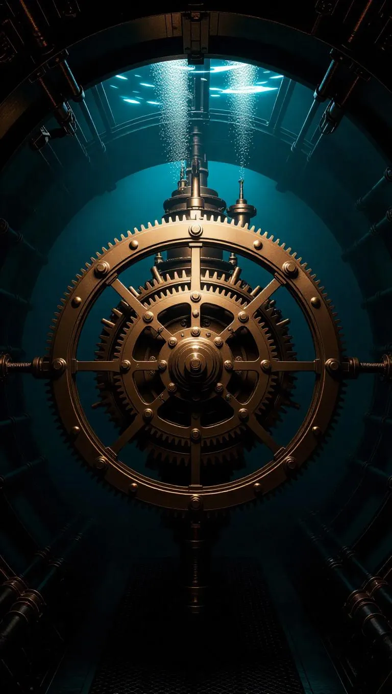 Dutch angle shot of a Victorian submarine exploring the depths of a trench, brass gears rotating against the abyss, air bubbles rising from deep-sea valves, oil-painting style with dark contrasts, mysterious underwater lighting, complex mechanical design, haunting anglerfish.