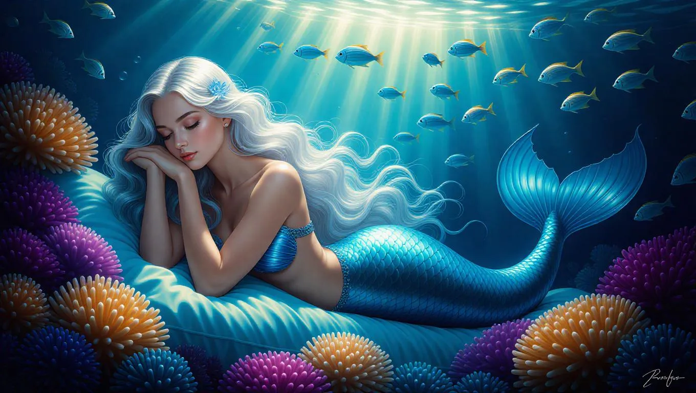 Digital oil painting of a mermaid with flowing silver hair resting on a bed of glowing corals, ethereal light cascading from above, soft and dreamy, surrounded by shimmering bioluminescent fish, with a mystical aura enhancing the serene underwater atmosphere.