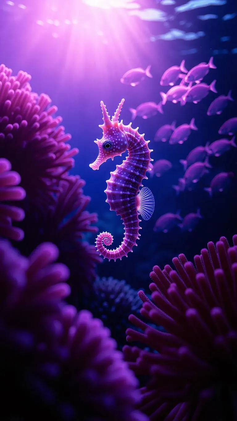 12. Underwater scene, a single seahorse whimsically centered in deep lilac waters, surrounded by a school of delicate fish, soft gradients transitioning from dark to light, clean and elegant lines, ethereal glow, gentle currents, colorful sponges in the background, sunlight filtering through the surface.