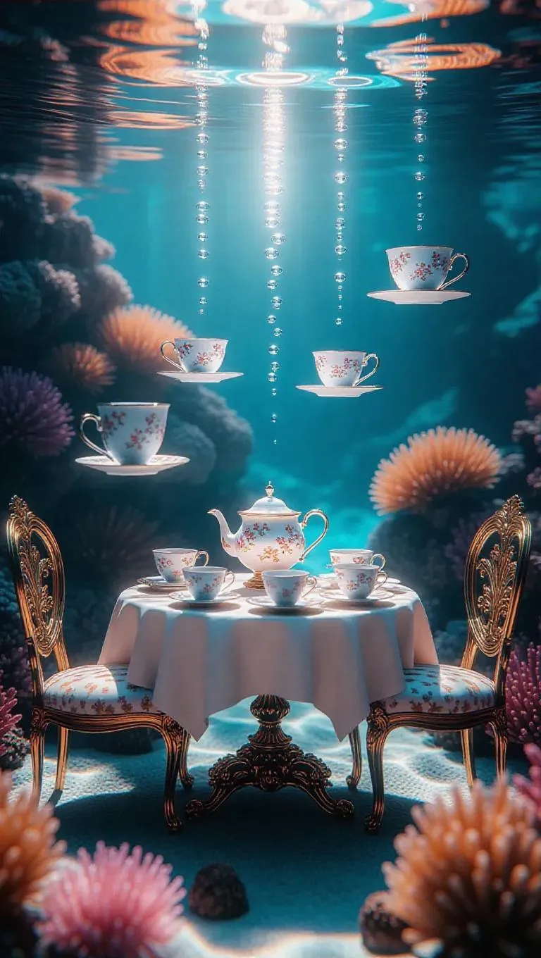 Surreal underwater tea party, floating teacups and chairs, vibrant colors, dreamy atmosphere, glimmering bubbles, soft ambient lights, coral reef backdrop, serene and whimsical.