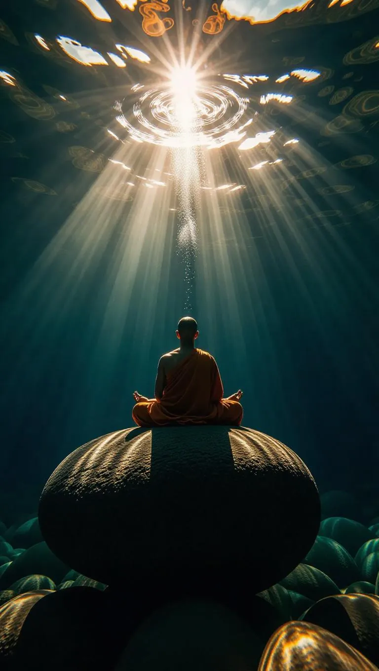 18. An ethereal underwater meditation scene with a serene monk perched on a smooth rock, surrounded by shimmering bubbles and radiant light rays piercing through the water, creating a tranquil and mystical atmosphere.