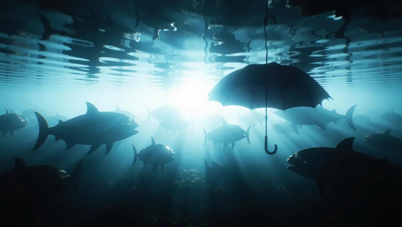 A glowing umbrella gently drifting underwater, surrounded by dark shadows of larger creatures lurking, creating a suspenseful and thrilling mood, with a sharp, contrasting light cutting through the gloom.
