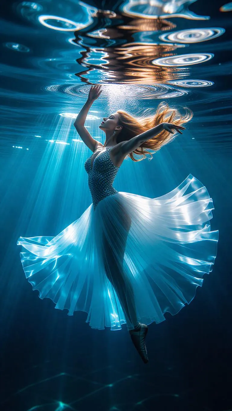 Surreal underwater ballet dancer, composed of shimmering water and radiant light, gracefully gliding through a serene, deep blue sea, surrounded by swirling currents, creating a mesmerizing dance of colors and motion.