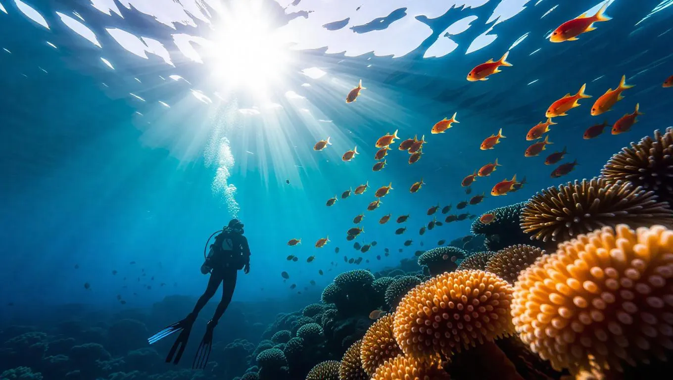 Top-down view of ocean diver observing jellyfish near a stunning coral landscape, schools of cardinalfish moving rhythmically, sunlight breaking through an elegant glass lookout, revealing a serene undersea view.