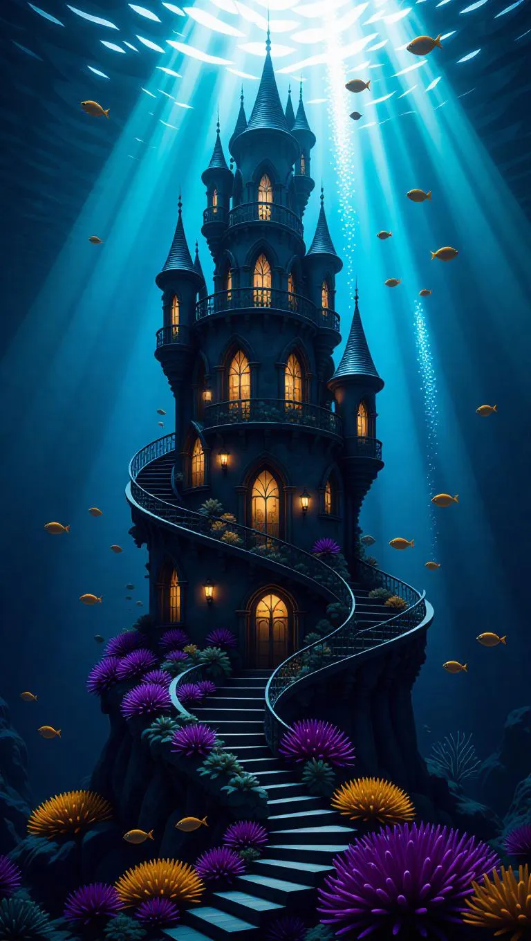 A vibrant underwater chateau spiraling upward, kissed by radiant surface light, clean lines, whimsical atmosphere, surrounded by rolling currents and sparkling water, with bioluminescent fish and fiery corals adding a magical glow.