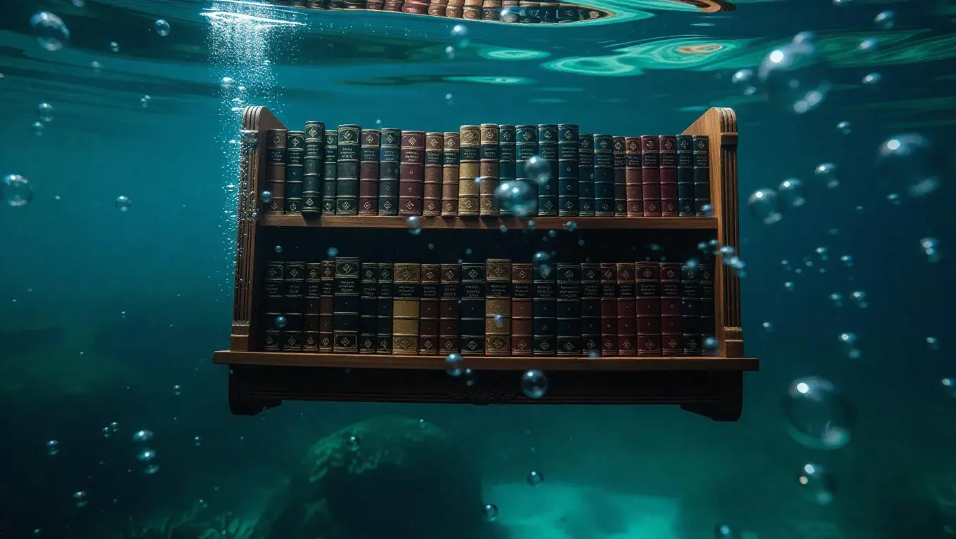 A floating grimoire shelf underwater, ancient and mysterious grimoires shutting and opening like ethereal spirits, surrounded by ocean currents and shimmering bubbles, casting an otherworldly glow, creating a mystical and enchanting atmosphere.