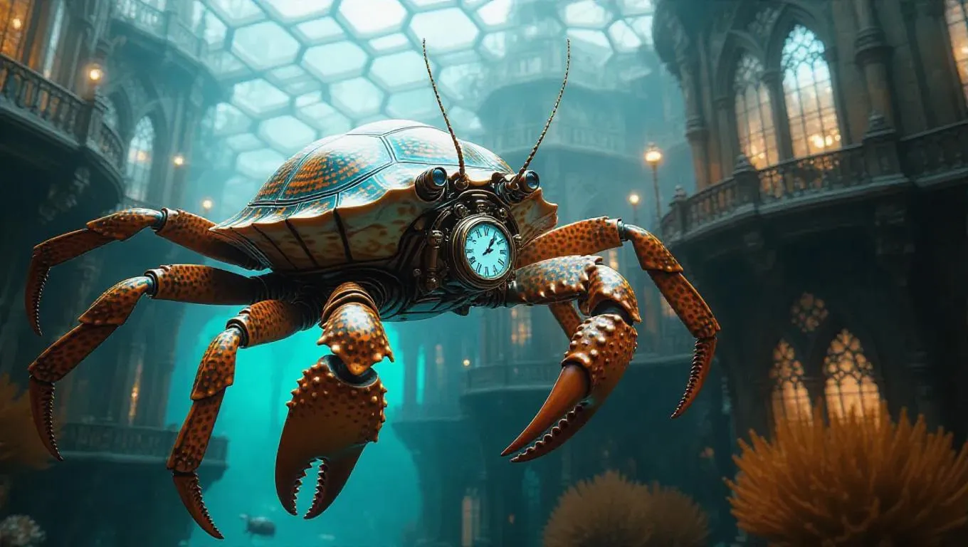 Steampunk crab-bus floating near neo-gothic coral scaffolding, turtle conductors quickly checking bronze pocket watches, hexagonal windows displaying streams of pixelated sea urchins, surreal style with dreamlike elements, ethereal atmosphere