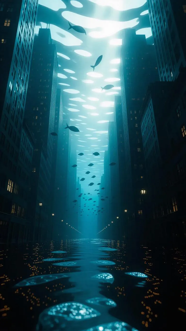 A cityscape scene underwater, submerged skyscrapers and streets, light bursting through the waves above, creating a haunting play of light and shadow, cinematic lighting, highly detailed, surrounded by fluttering ribbon-like fish.