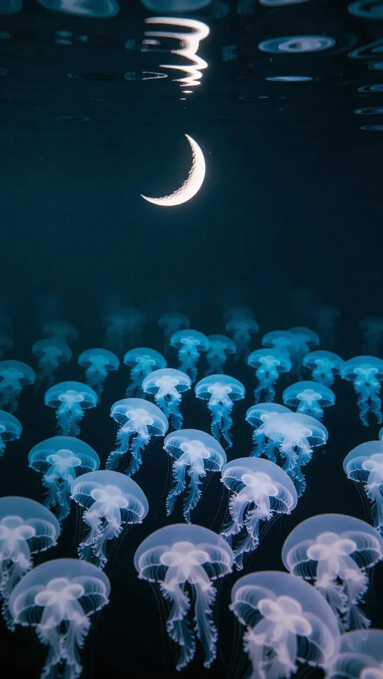 A serene minimal underwater night scene, a slender crescent moon visible through the water's surface, a school of jellyfish pulsing softly, creating a tranquil and ethereal atmosphere.