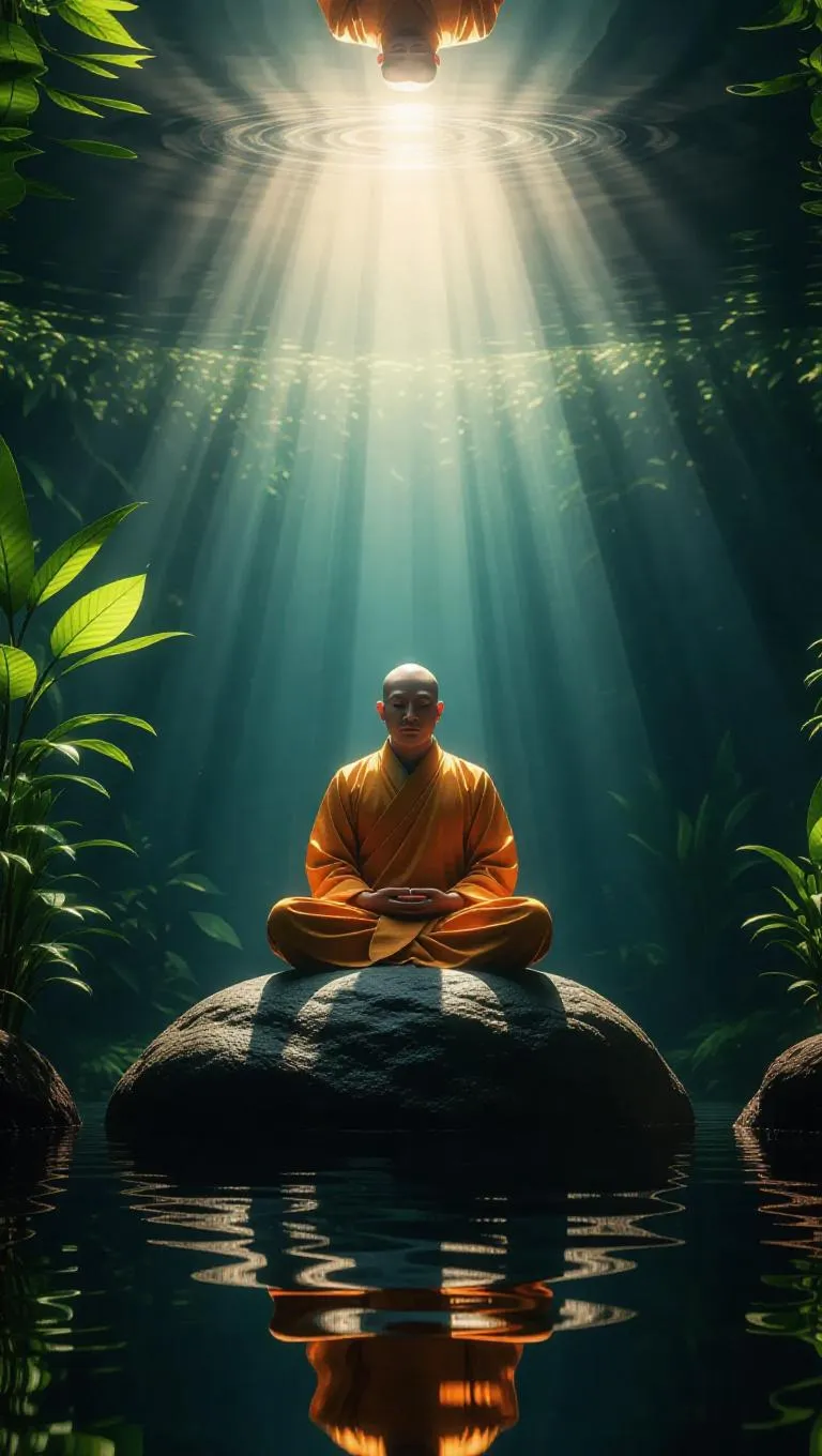 11. An ethereal underwater meditation scene with a serene monk seated cross-legged on a smooth rock, surrounded by vibrant plant life and radiant light rays piercing through the water, creating a tranquil and mystical atmosphere.