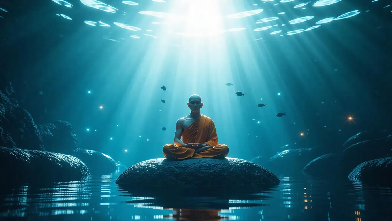 10. An ethereal underwater meditation scene with a serene monk seated cross-legged on a smooth rock, surrounded by glowing sea creatures and radiant light rays piercing through the water, creating a tranquil and mystical atmosphere.