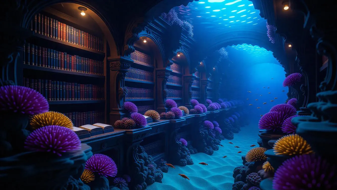 Fantasy underwater library intricately carved into vibrant coral reef walls, floating scrolls emit a soft, ethereal glow, glowing lighting creates a mystical atmosphere, surrounded by serene currents and colorful shrimp.