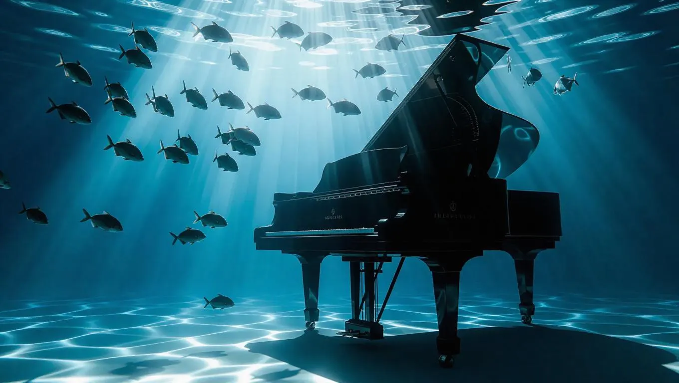 A surreal underwater scene of a grand piano partially cloaked in darkness, rays of sunlight barely penetrating, creating a mesmerizing play of light and shadow, stark lighting, highly detailed, surrounded by swirling schools of shadowy fish.