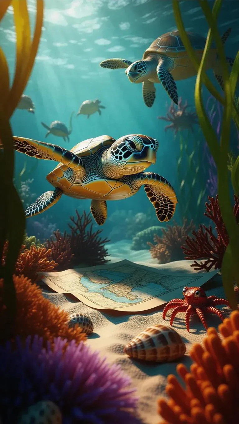 A mysterious underwater detective scene, an agile sea turtle investigates a missing pearl case, interrogating a reluctant octopus and a jittery crab. Clues like cracked shells and a ruffled map are scattered among vibrant coral and bending seaweed, creating a suspenseful and intriguing atmosphere.
