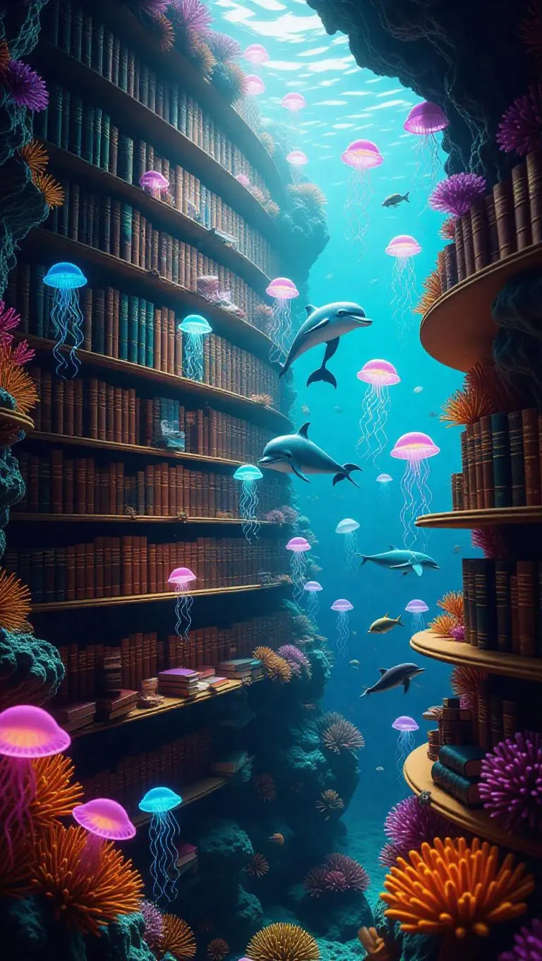 Fantasy underwater library intricately carved into vibrant coral reef walls, floating tomes emit a soft, ethereal glow, celestial lighting creates a wondrous atmosphere, surrounded by swirling jellyfish and playful dolphins.