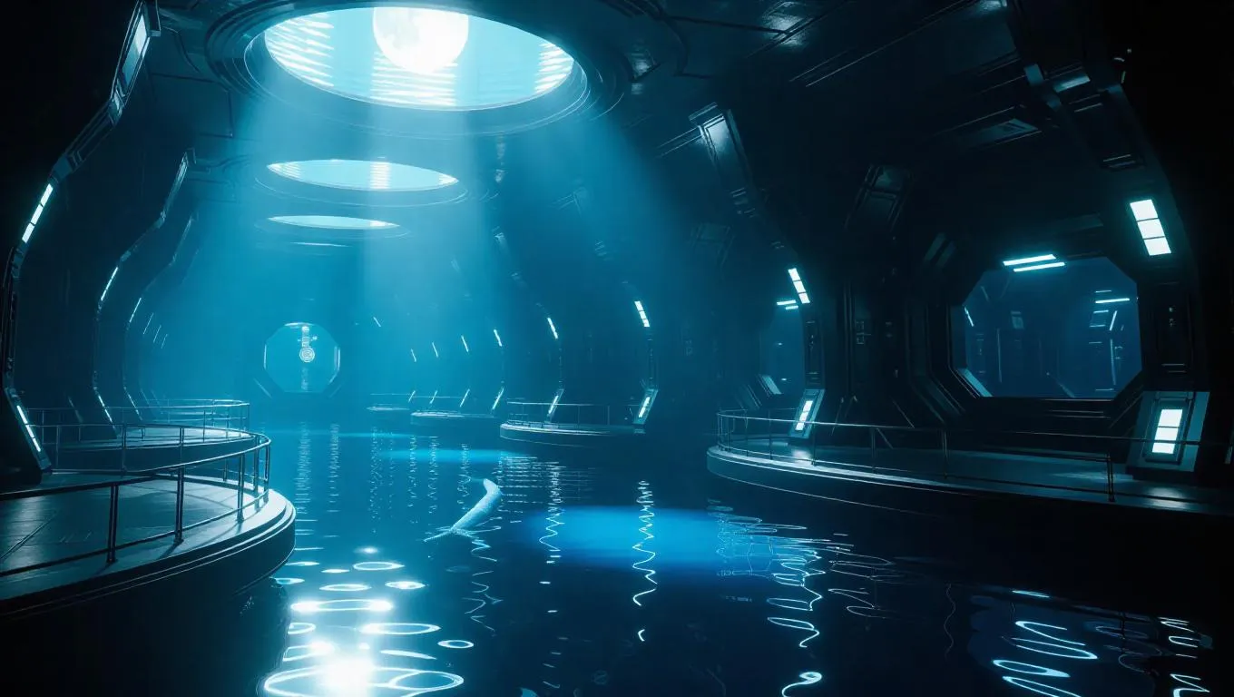 A futuristic scene underwater, with submerged observation decks and advanced technology, rays of moonlight reflecting off surfaces, creating a mesmerizing play of light and shadow, playful lighting, highly detailed, surrounded by darting electric eels.