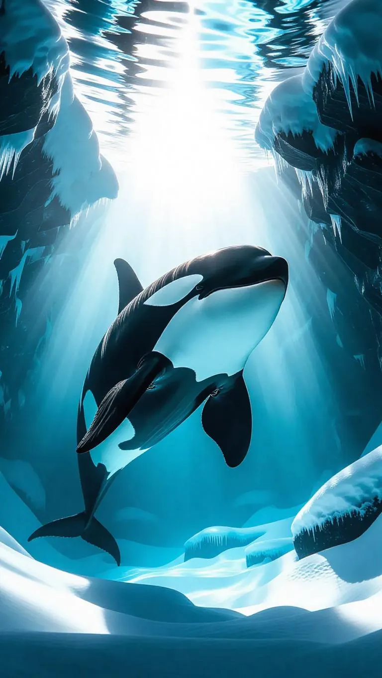 Cinematic shot of a massive orca swimming beneath ice-covered waters, ethereal light beams piercing through jagged cracks above, creating a mesmerizing underwater glow.