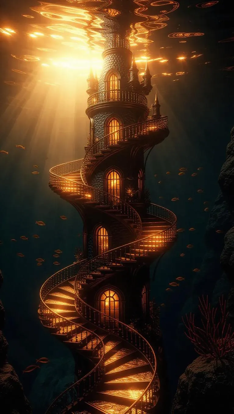 A surreal underwater chateau spiraling upward, caressed by shimmering golden surface light, smooth lines, magical atmosphere, surrounded by gentle currents and flowing water, with bioluminescent fish and fiery marine plants adding a magical glow.