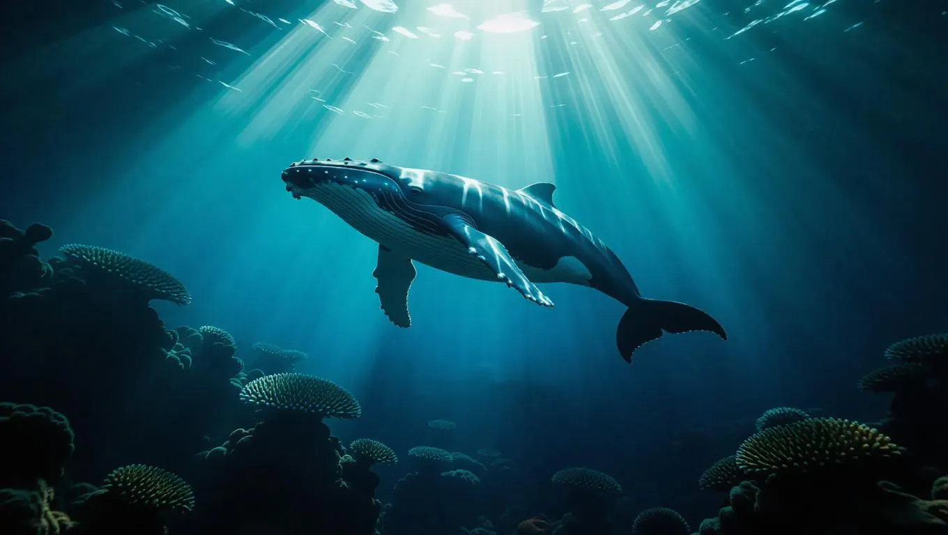 Cinematic shot of a luminous whale gliding towards a coral reef, ethereal light beams piercing through jagged cracks above, creating a mesmerizing underwater glow.