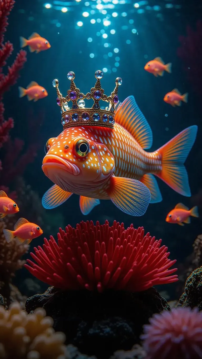 A vibrant mystical catfish wearing a dazzling crown, nestled upon a striking coral base, surrounded by playful tiny, bioluminescent pufferfish, set in an enchanting underwater fantasy environment, with sparkling water and dreamlike light.