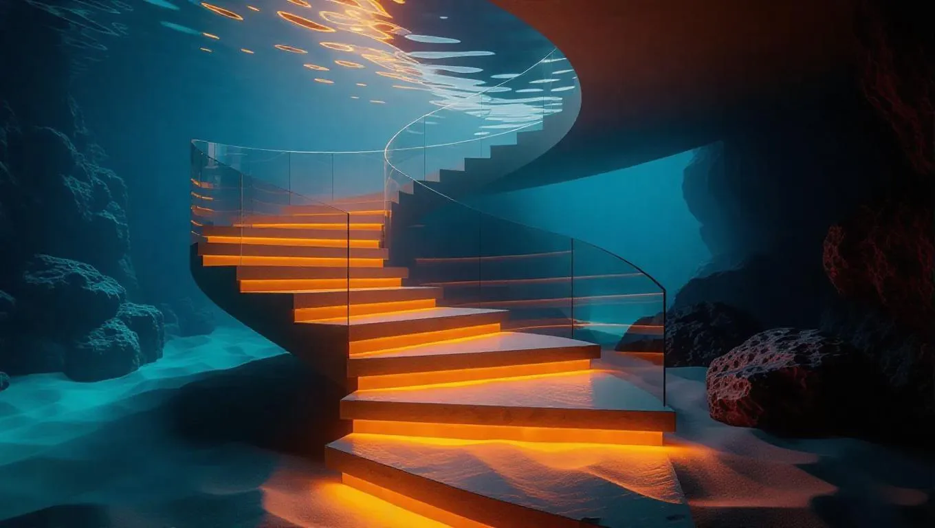 A surreal underwater staircase spiraling upward, basking in twilight hues, flowing lines, relaxing atmosphere, surrounded by gentle tides and radiant water.
