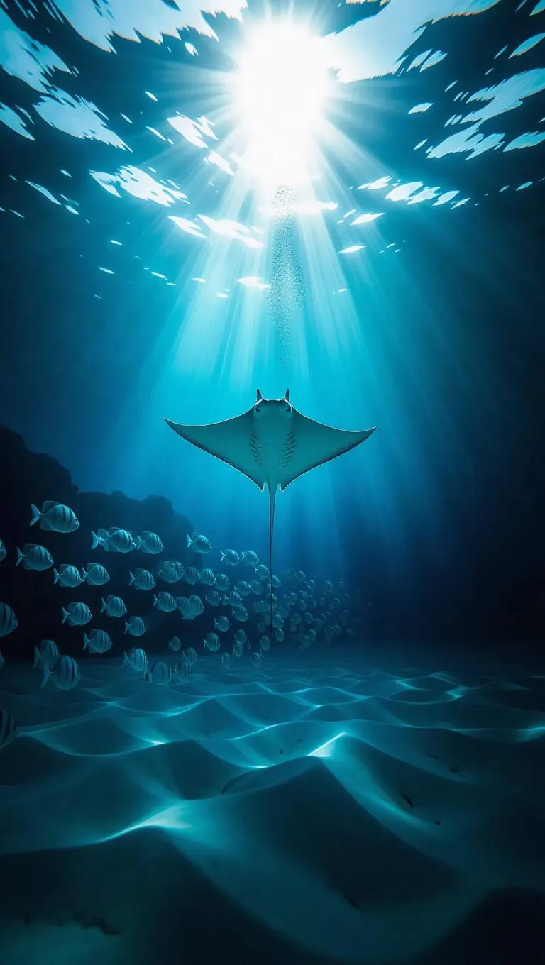 3. Underwater scene, a single stingray gliding centered in deep cerulean waters, surrounded by a school of glowing fish, soft gradients transitioning from dark to light, clean and elegant lines, ethereal glow, gentle currents, sandy seabed in the background, sunlight filtering through the surface.