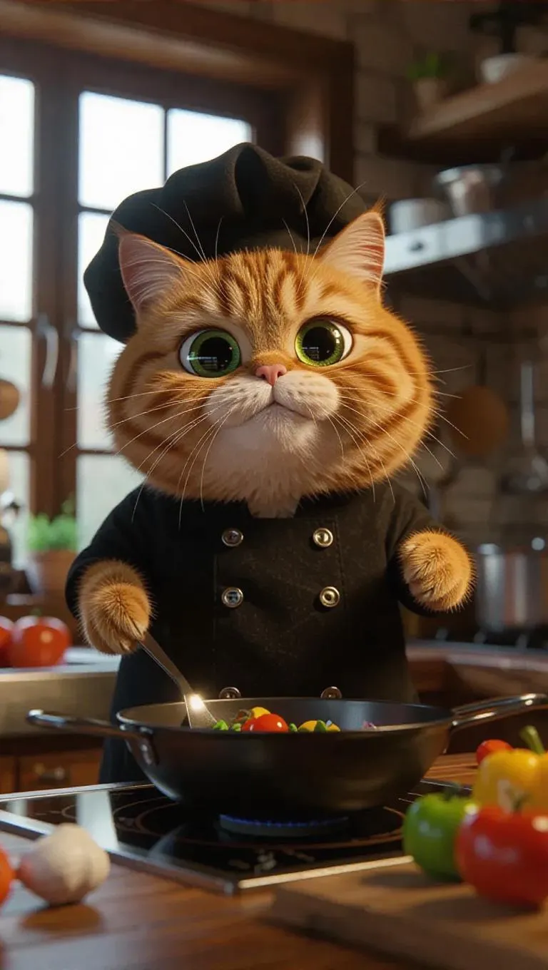 Generate a playful 3D cartoon of a chubby orange cat chef in black attire with big green eyes, cooking in the kitchen using vivago.ai's AI image generator. Transform text prompts into vibrant, professional-grade visuals with curated AI effects and creative tools for stunning results.