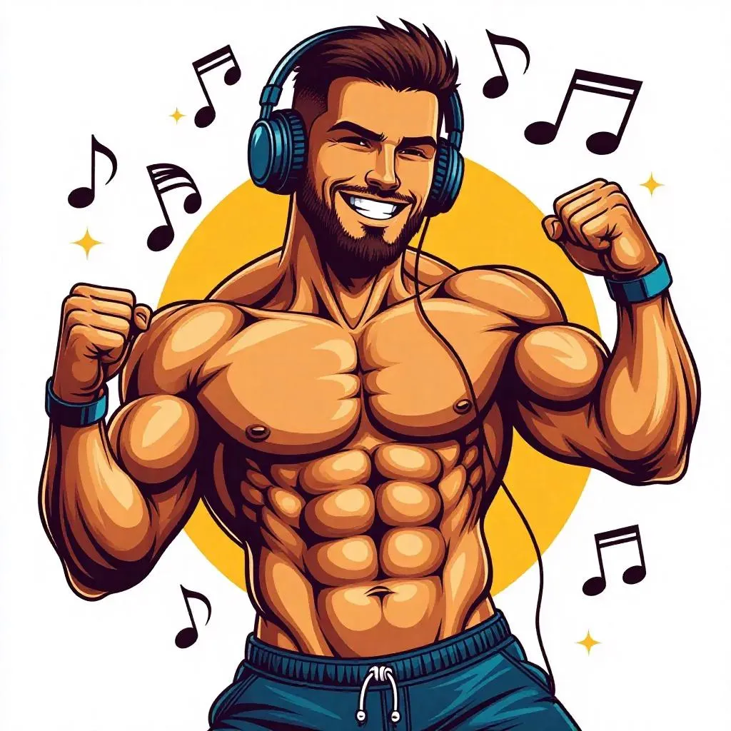Create vibrant cartoon visuals of a strong shirtless man wearing headphones, surrounded by bouncing music notes. Generate this dynamic AI art instantly with vivago.ai's powerful creative tools. Transform your prompts into professional, eye-catching images effortlessly.