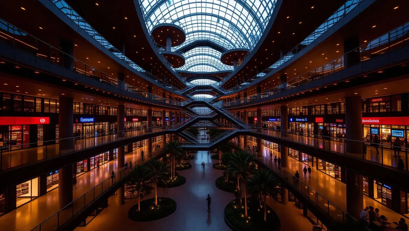 Experience vivago.ai's AI-generated futuristic amusement park: a breathtaking 50-story vertical wonder with multi-tiered thrill rides lining a central atrium. Soar past interactive exhibits under a massive glass-domed ceiling. Sleek balconies offer panoramic views of vibrant arcades and attractions, all bathed in natural light. Create your own immersive entertainment complex with AI-powered creativity.