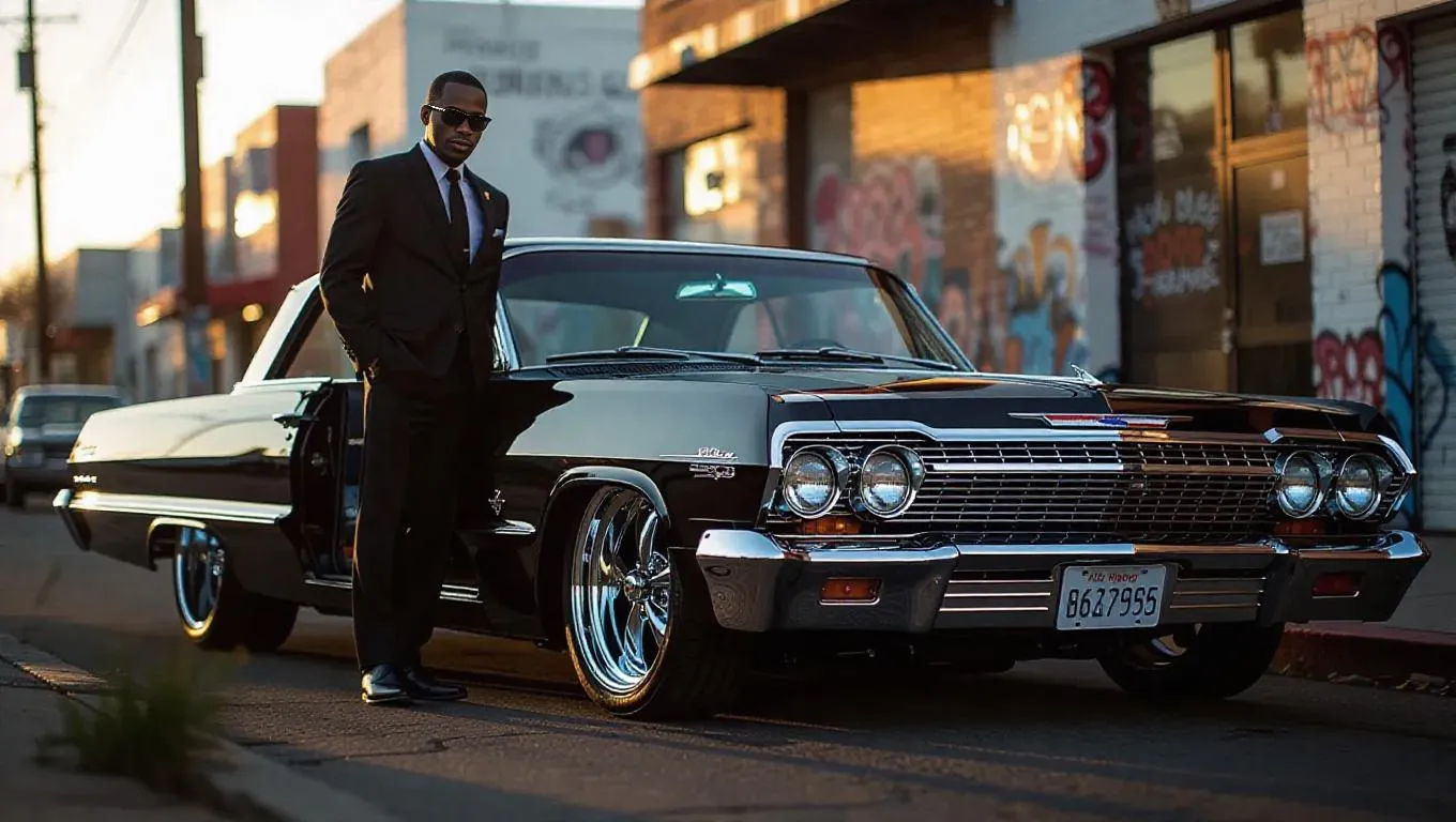 AI-generated image of a sharply dressed African-American man exiting a retro-modern 1963 Chevy Impala, upgraded with $2M high-tech audio systems, custom rims, and navigation. Vibrant urban sunset setting highlights gleaming chrome details, blending vintage car culture with futuristic AI effects for bold, luxury automotive visuals.