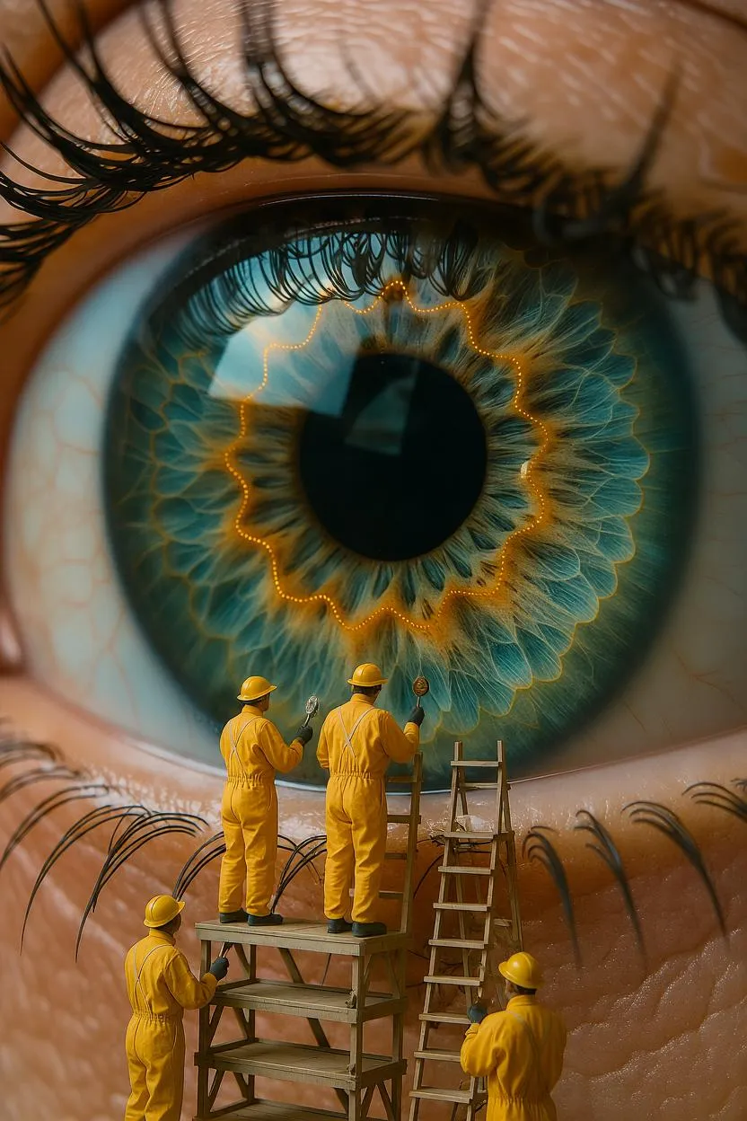 A close-up of a giant, ultra-detailed human eye, lifelike and surreal. Inside the iris, a tiny crew of workers dressed in yellow jumpsuits, akin to honey harvesters, paint vibrant, iridescent patterns onto the eye's surface, creating golden, amber, and opal spirals. They use suspended platforms and tiny ladders, their movements precise and delicate. The sclera subtly reflects hexagonal honeycomb patterns. Soft, dreamlike ambient lighting with macro focus and shallow depth of field enhances the hyper-real, poetic, and imaginative blend of Wes Anderson precision and Ghibli-like whimsy.